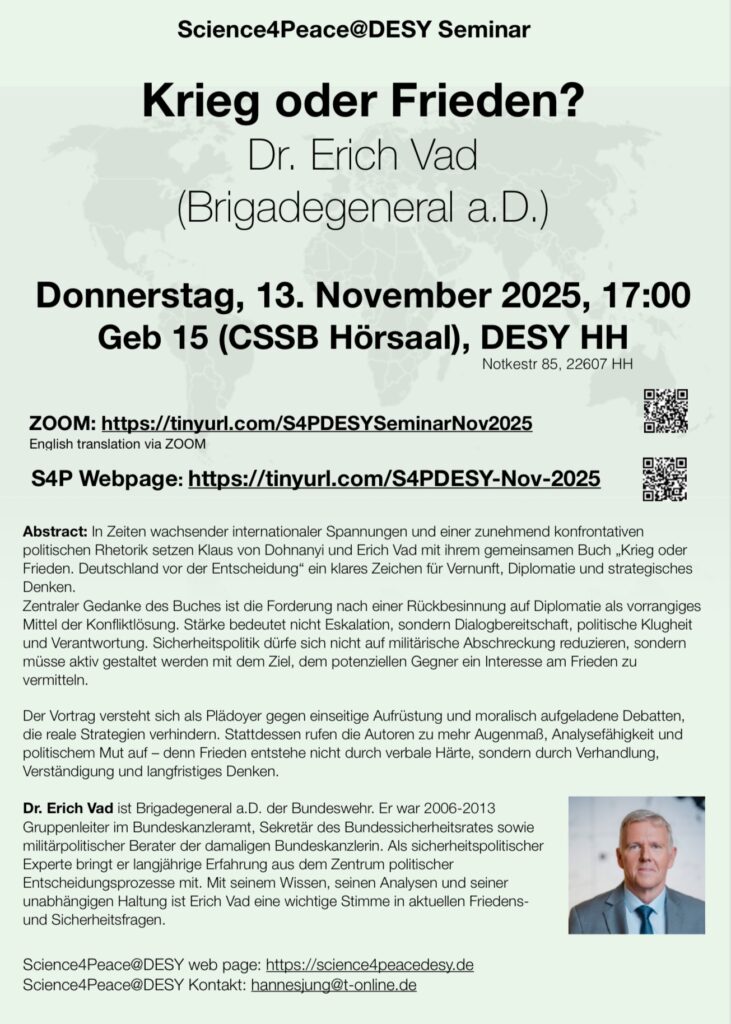 Die Initiative Science4Peace@DESY ist ein Zusammenschluss von engagierten DESY-Beschäftigten und Ehemaligen. Sie organisiert die Seminare eigenständig und unabhängig von DESY – aus Überzeugung, dass Wissenschaft Verantwortung trägt.